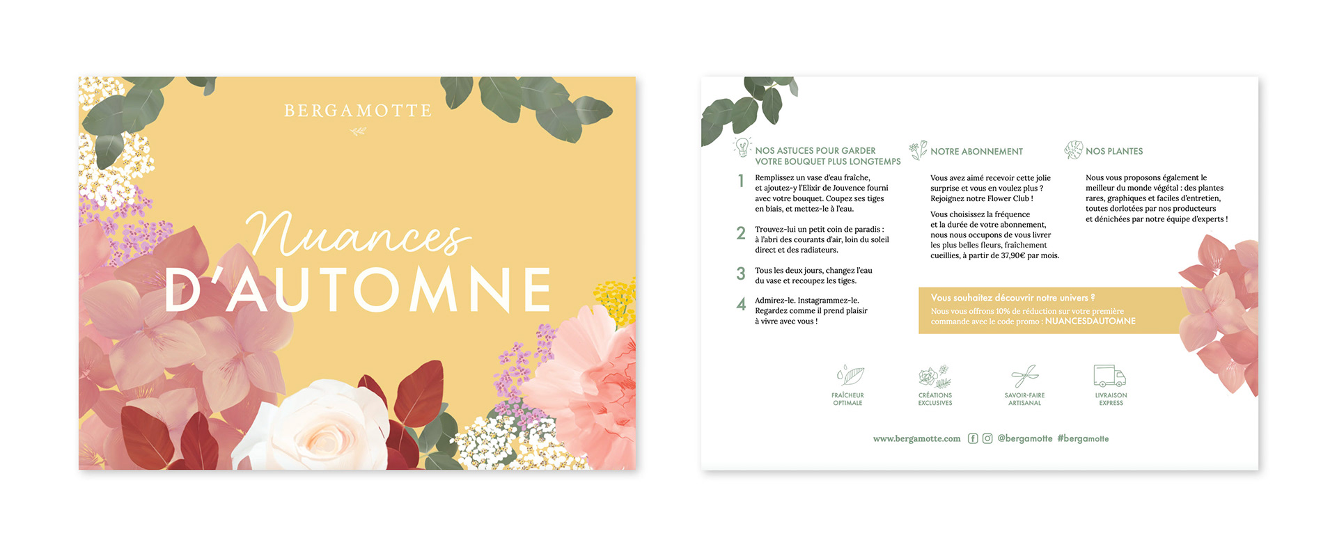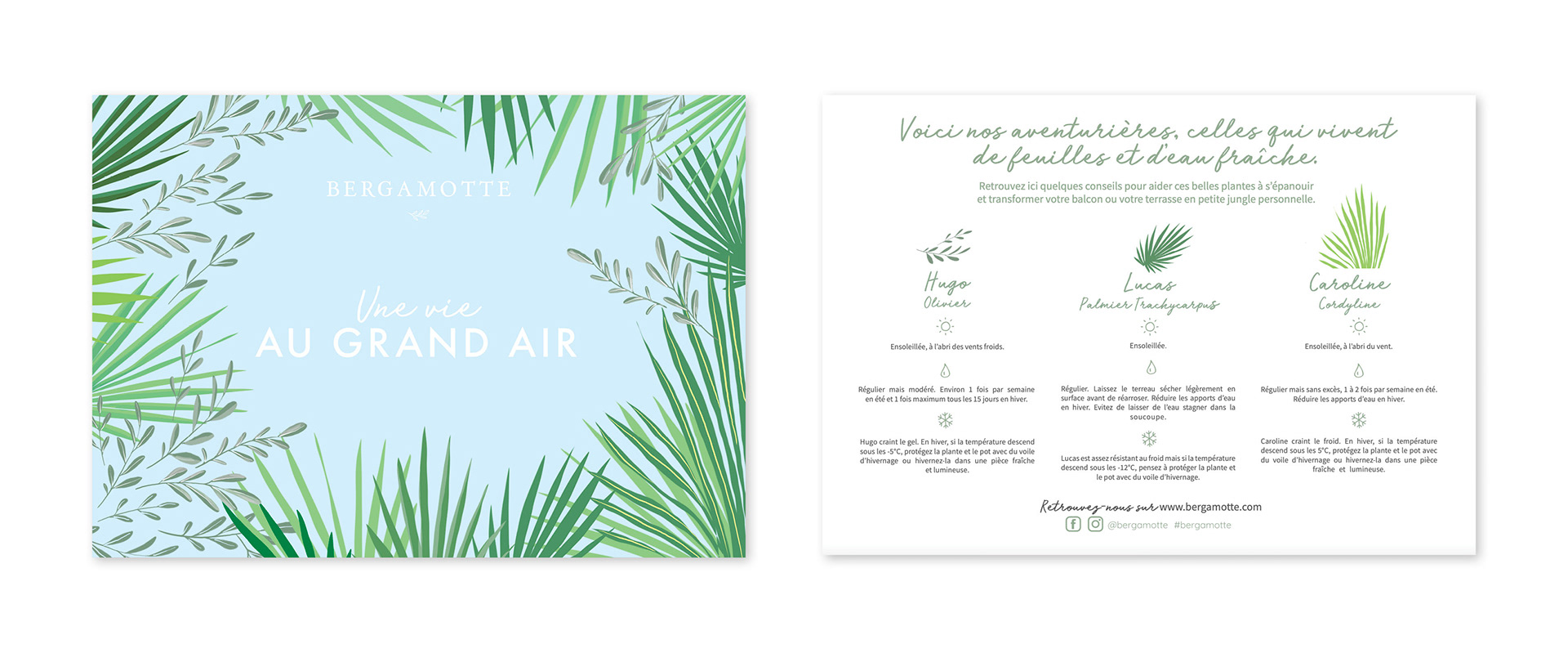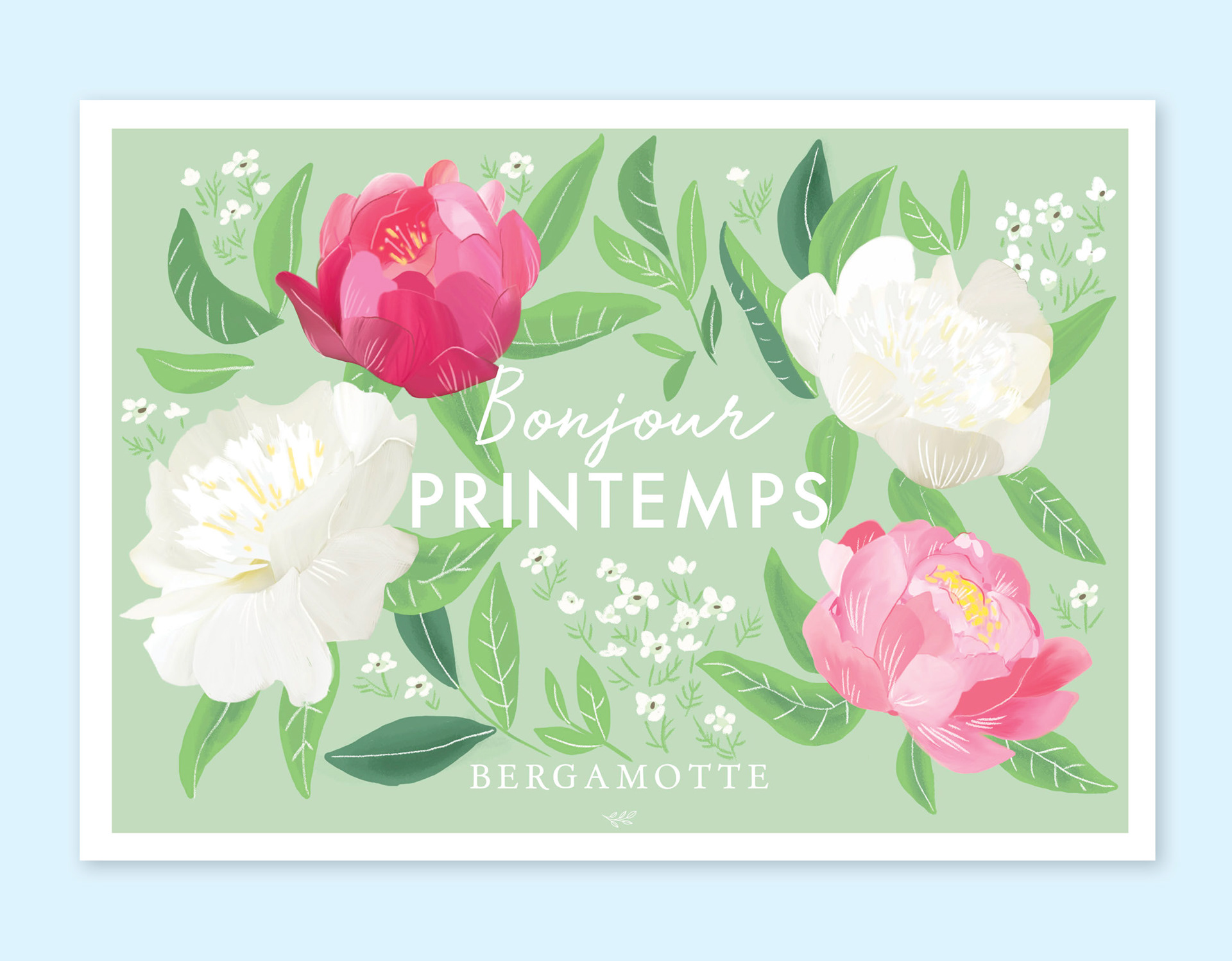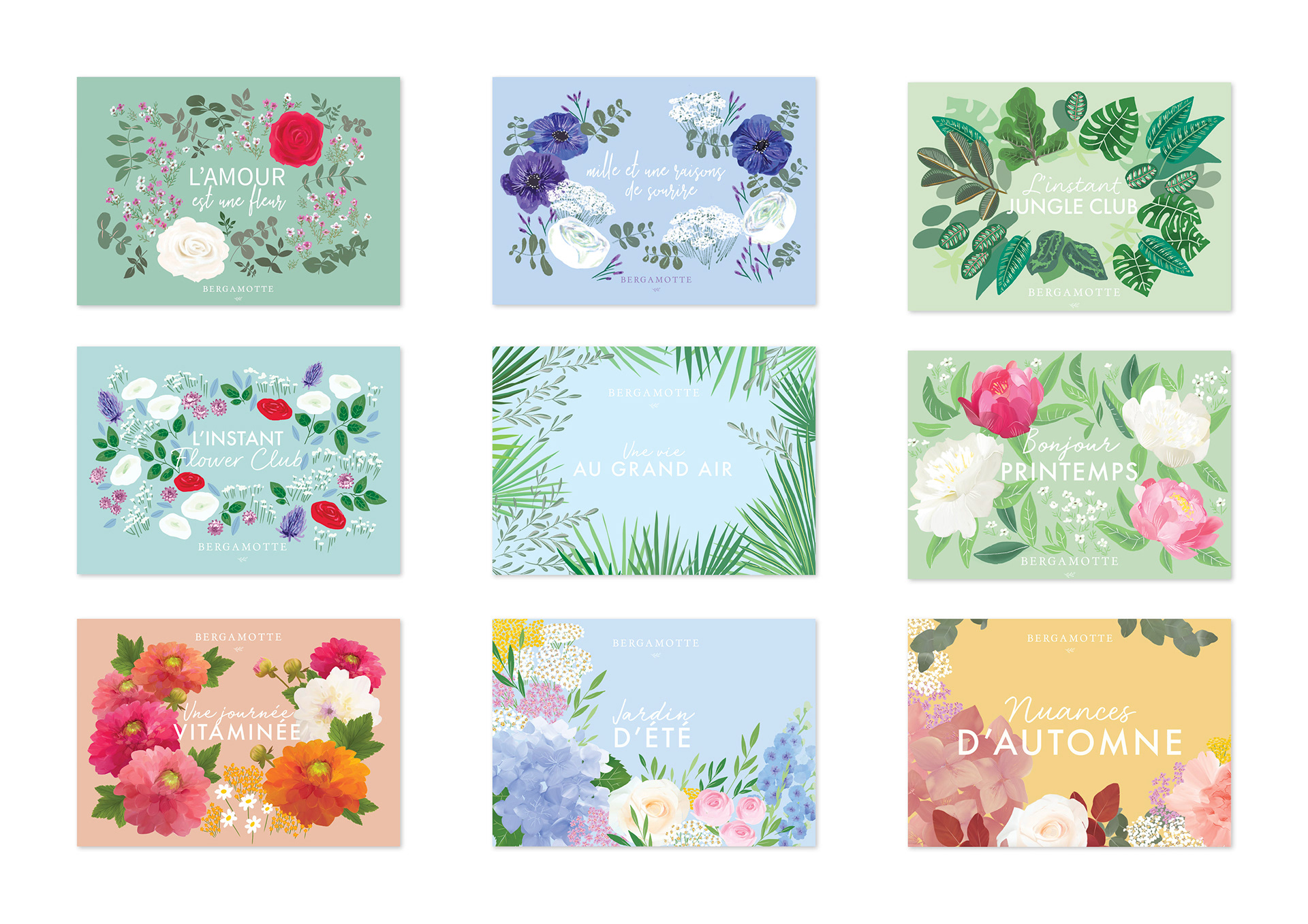 Illustration au fil de l'année 2019 des cartes accompagnant les commandes clients Bergamotte. Dessin, mise en page et impression.