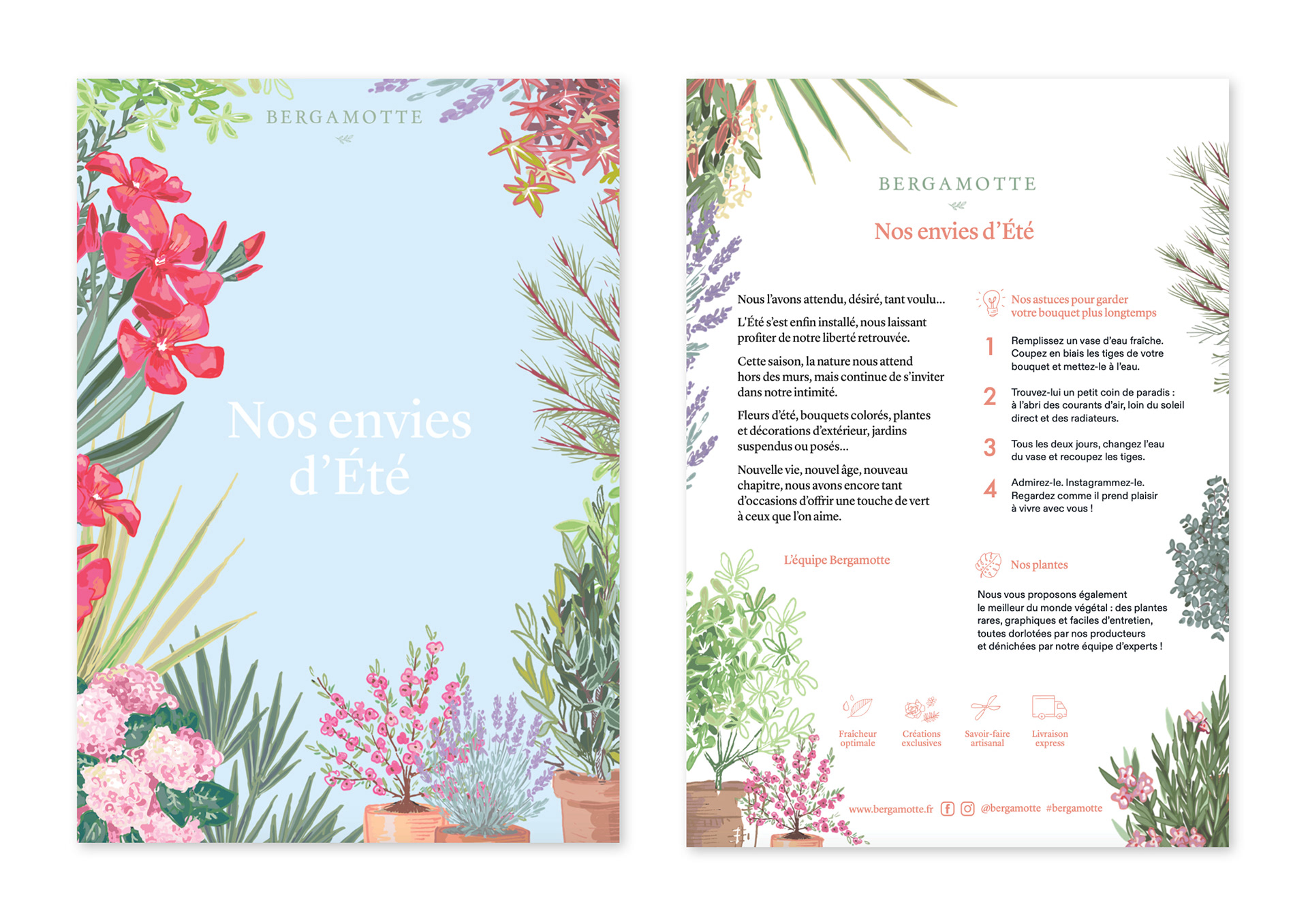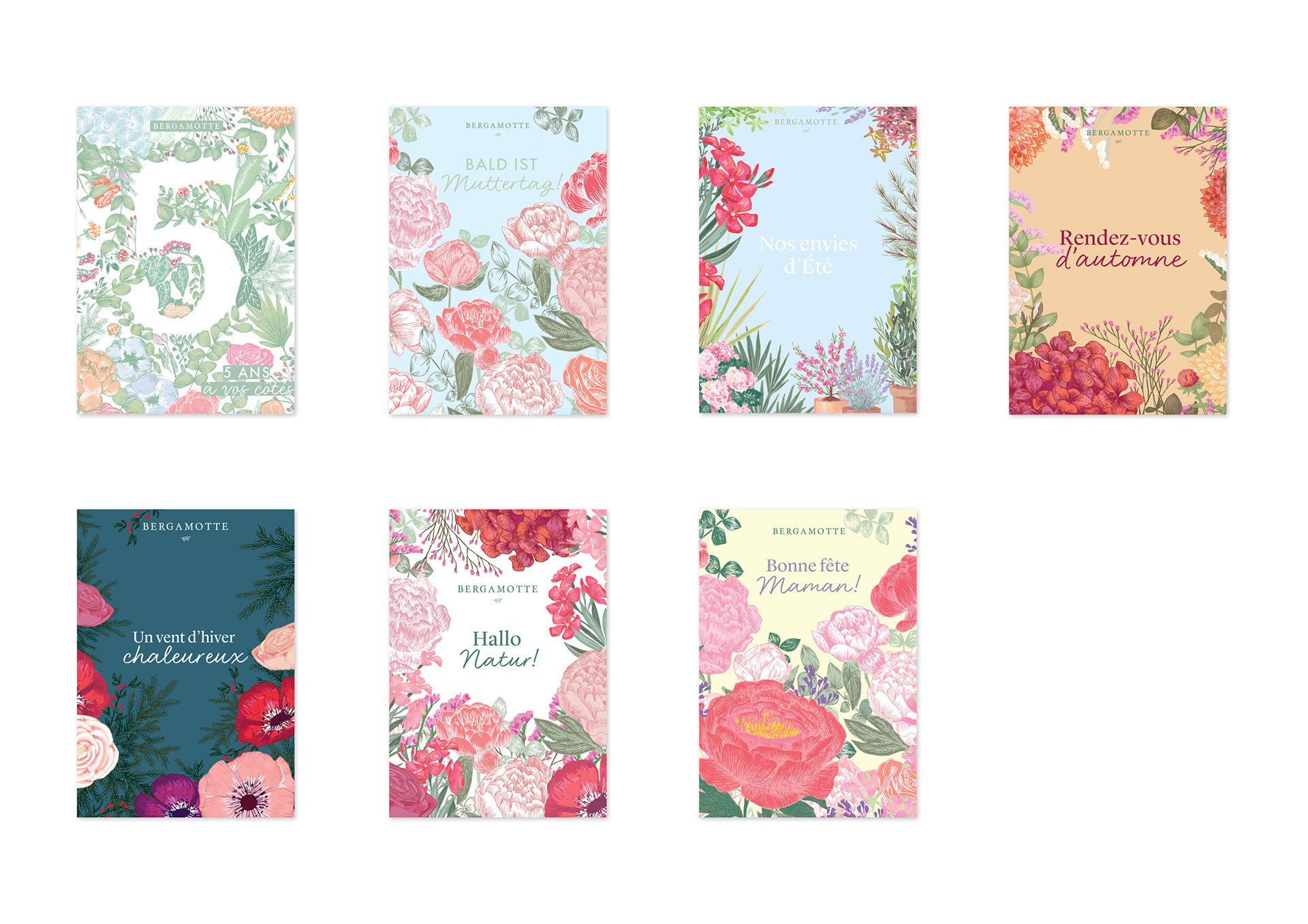 Illustration au fil des saisons 2021 des cartes accompagnant les commandes clients Bergamotte. Dessin, mise en page et impression.