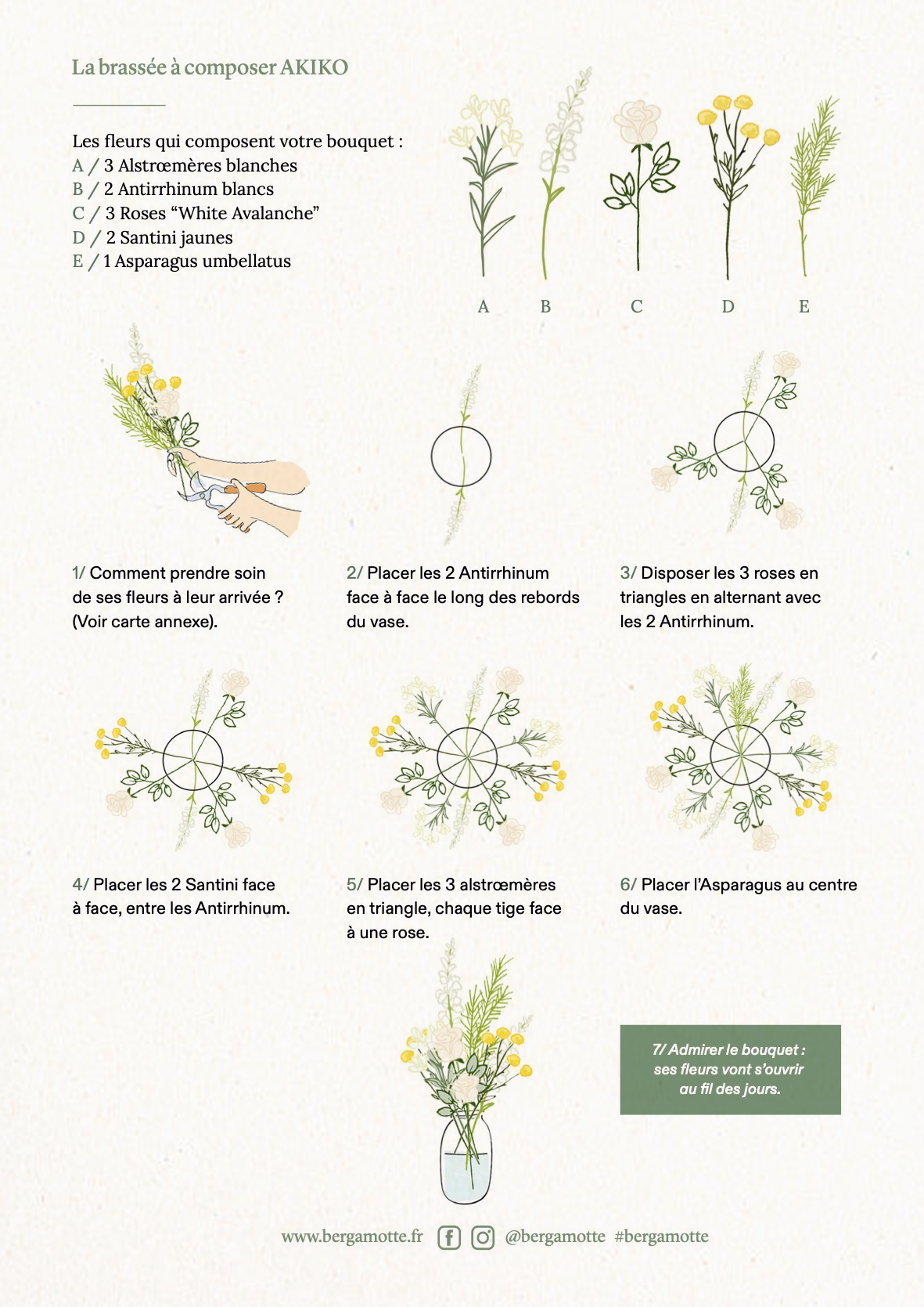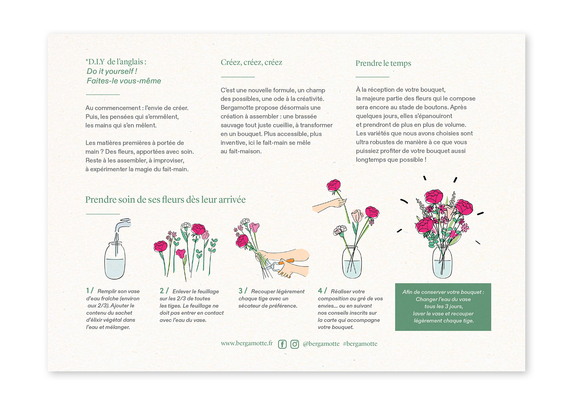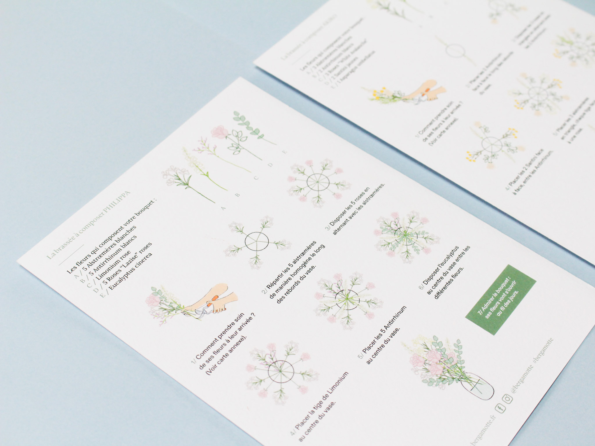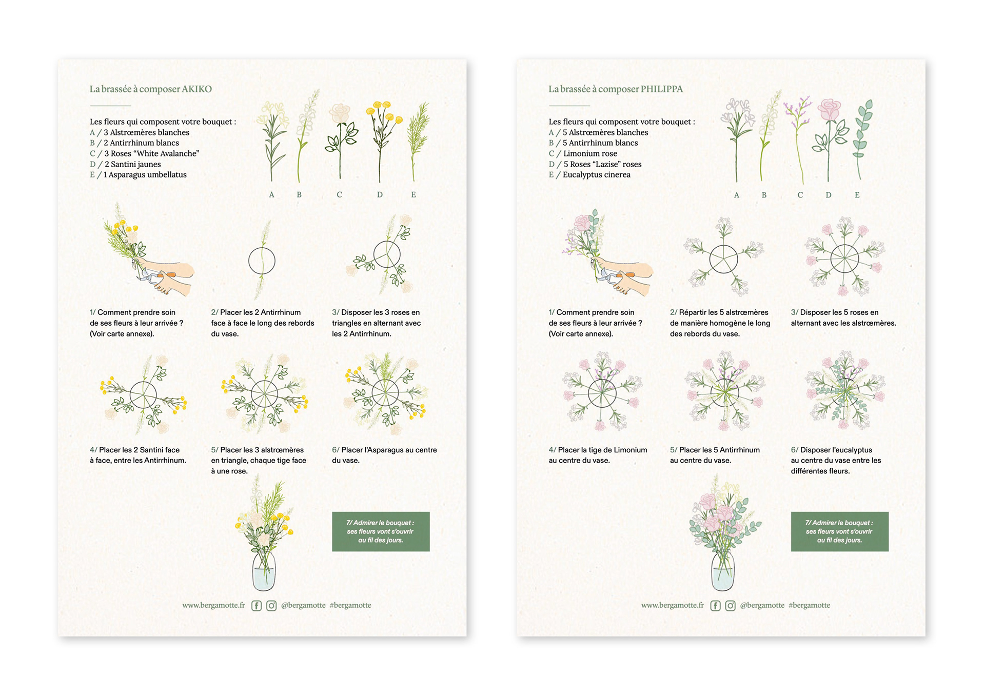 Réalisation de tutoriels illustrés pas-à-pas pour les clients Bergamotte. Ces cartes accompagnent la collection DIY, des bouquets à réaliser soi-même.